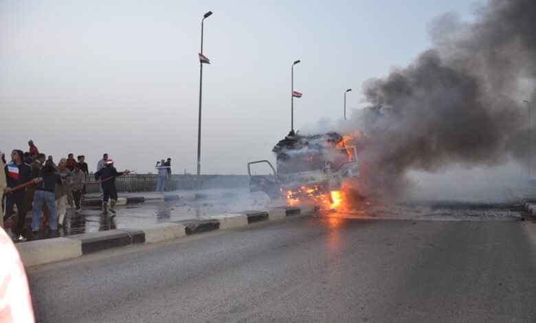 احترقت سيارة نصف نقل بعد اشتعال النار بها وهروب سائقها أعلى كوبري النيل العلوي بمدينة بني سويف مما نتج عنه