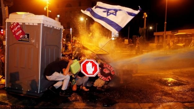 والآن، وعلى بعد عشرات الأمتار من مقر إقامة نتنياهو في القدس، يتجمع المئات وأحيانًا الآلاف من الناس ليلًا ويدعونه إلى الاستقالة.