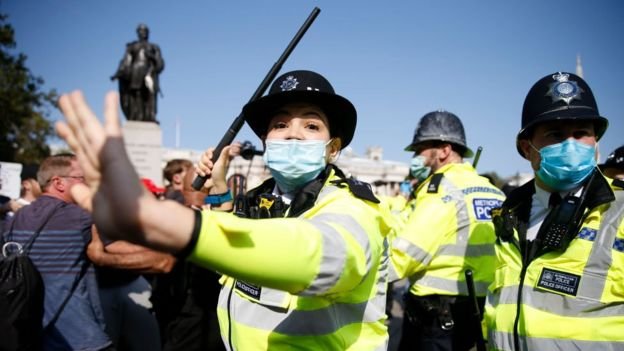 وتسرد صحيفة الأوبزرفر بعضاً من مشاهد التدخل الأمني الذي يشمل تفكيك حفل زفاف في مانشستر وفض بعض التجمعات العائلية، كما تنقل عن الشرطة تحذيرها من سيناريو الاعتقال الذي قد يواجه مزيدا من المحتجين الذين نظموا مظاهرات في وسط لندن تنديدا منهم بتشديد إجراءات الإغلاق في أجزاء من إنجلترا، وقد ارتدى بعضهم قمصانا رُسمت وكُتبت عليها دعوات لإقالة كبار المستشارين العلميين الذين تعتمد عليهم الحكومة في قراراتها، واصفين فيروس كورونا بالخدعة.