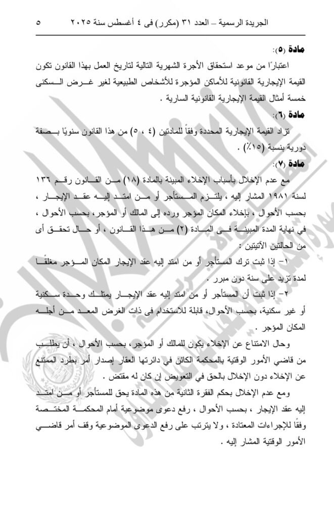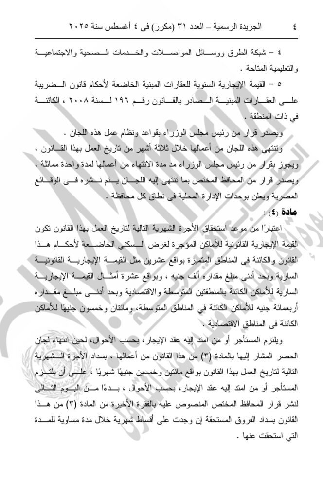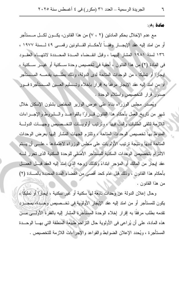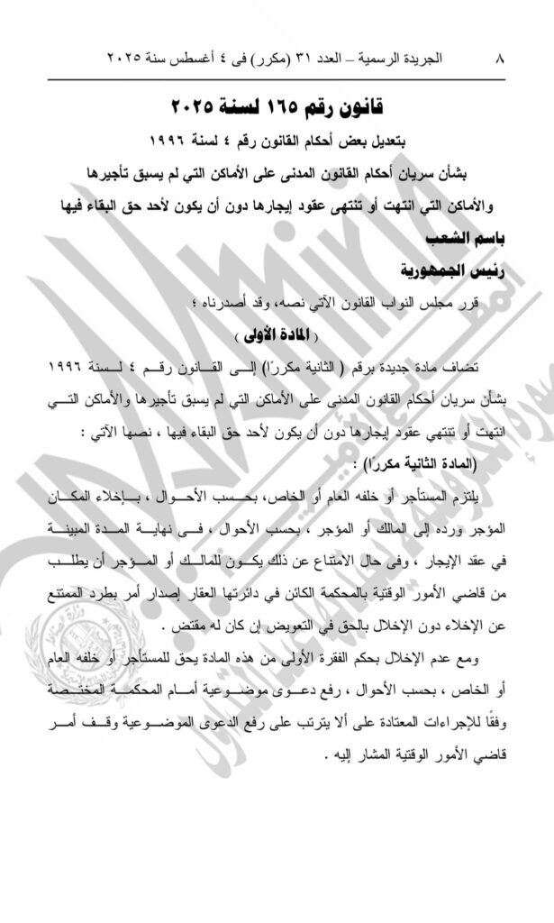 وأصدر الرئيس عبد الفتاح السيسي قانون رقم 165 لسنة 2025، بتعديل بعض أحكام القانون رقم 4 لسنة ١٩٩٦ بشأن سريان أحكام القانون المدنى على الأماكن التي لم يسبق تأجيرها والأماكن التي انتهت أو تنتهى عقود إيجارها دون أن يكون لأحد حق البقاء فيها.