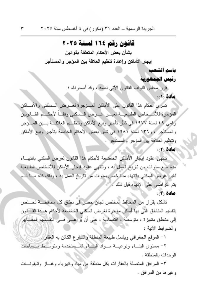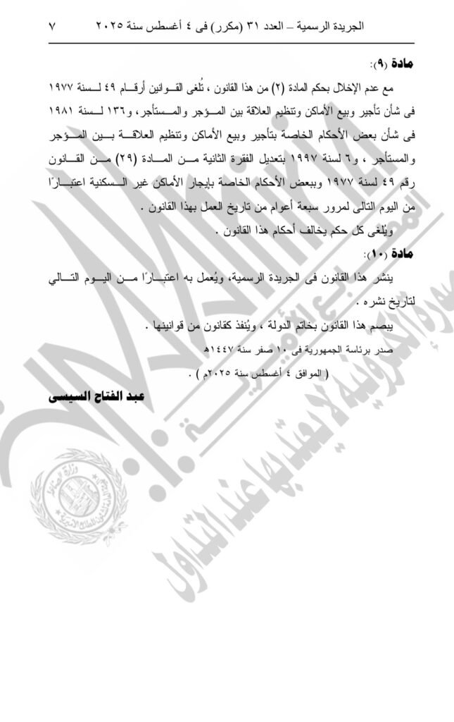 وصدق الرئيس السيسي على قانون رقم 164 لسنة ٢٠٢٥، بشأن بعض الأحكام المتعلقة بقوانين إيجار الأماكن وإعادة تنظيم العلاقة بين المؤجر والمستأجر.