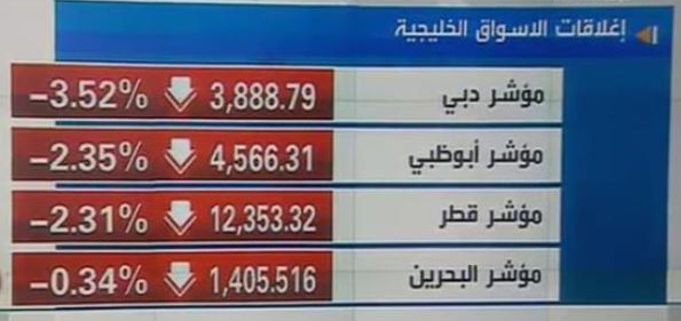 وانخفض مؤشر سوق أبوظبي 2.01%، فيما تراجع مؤشر بورصة قطر 2.31%، ومسقط 3.26%، البحرين 0.34%.