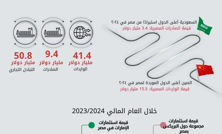 وجـاءت السعودية على رأس قائمة أعلى مجموعة دول البريكس استيراداً من مصرخلال عام 2024، حيث بلغت قيمة صادرات مصر لها 3.4 مليار دولار، يليها الإمارات 3.3 مليار دولار، ثم البرازيل 854.4 مليون دولار ، ثـم روسيا 606.8 مليون دولار، ثم الهند 517.4 مليون دولار ثم الصين 393.6 مليون دولار ، ثم إندونيسيا 151.3 مليون دولار، ثم جنوب إفريقيا 114 مليون دولار ، ثم إثيوبيا 113 مليون دولار ، ثم ايران 2.4 مليون دولار .