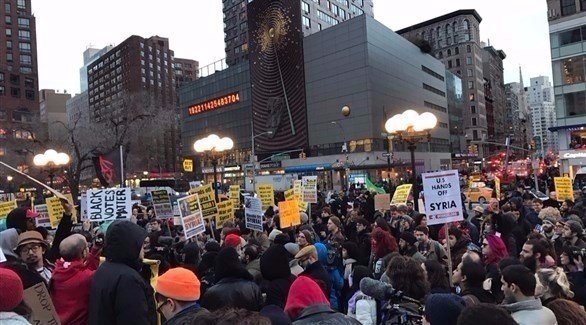 خرج مئات المتظاهرين إلى شوارع مدينة نيويورك الأمريكية، معبرين عن رفضهم لقرار الرئيس الأمريكي دونالد ترامب بضرب القاعدة الجوية في