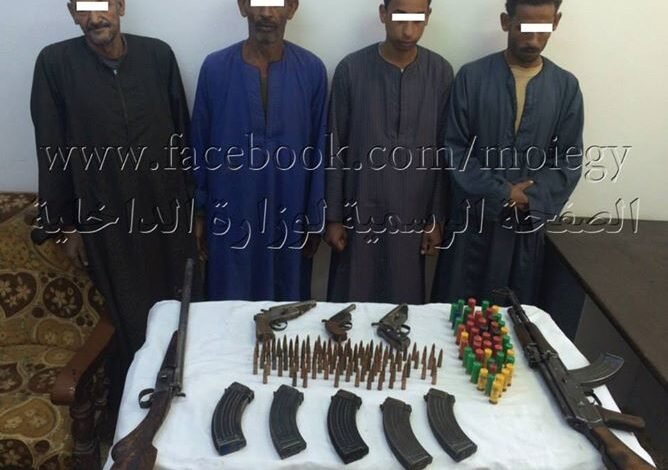 تمكنت مباحث مركز شرطة ساحل سليم من ضبط ( صبرى . ر . م – وشهرته برجى – سن 42 – سائق – ومقيم بجزيرة العونة ) .. وبحوزته ( بندقية آلية عيار 7,62×39مم ، عدد 17طلقة نارية من ذات العيار ) .