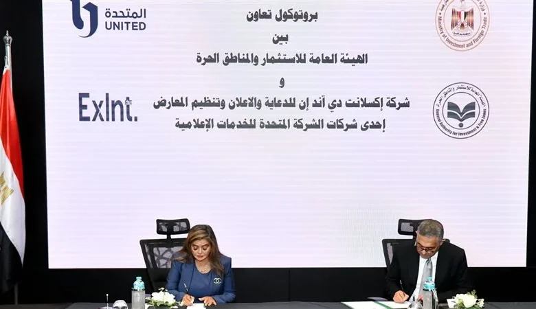 وقع حسام هيبة، الرئيس التنفيذي للهيئة العامة للاستثمار والمناطق الحرة، ودينا عبد الفتاح، رئيس مجلس إدارة شركة إكسلانت دي آند إن للدعاية والإعلان وتنظيم المعارض، التابعة للشركة المتحدة للخدمات الإعلامية، بروتوكول تعاون لتنفيذ استراتيجية للتوعية والتسويق والترويج للاستثمار في مصر.