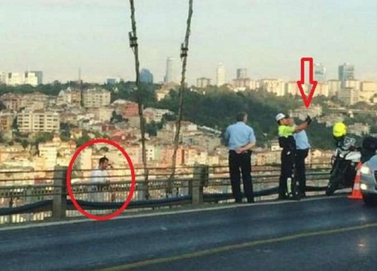 وفي الوقت الذي كان أفراد الشرطة يحاولون فيه تهدئة الرجل وإقناعه بعدم القفز، شوهد شرطي تركي «مهووس بالسيلفي» وهو يلتقط صورة لنفسه يظهر في خلفيتها الرجل الذي يحاول الانتحار، والذي قفز بالفعل بعدها بلحظات، ليلقى حتفه، فيما يخضع الشرطي للتحقيق.